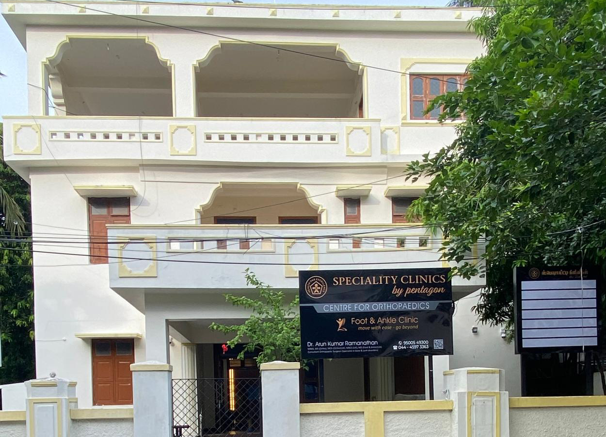 Speciality Clinics by Pentagon is a premier multispeciality healthcare destination in Gandhi Nagar, Adyar—one of Chennai’s most centrally located and easily accessible neighbourhoods. The facility brings together leading specialists across key medical disciplines, supported by advanced technology and a strong focus on patient-centred care. Its flagship Centre for Orthopaedics is home to Chennai’s first dedicated Foot and Ankle Clinic, offering specialised expertise for complex conditions that are rarely addressed with such depth. The clinic also places a strong emphasis on accurate, high-quality reporting, with in-house facilities for X-ray imaging, comprehensive laboratory testing, advanced foot scanning, custom orthotics, and well-equipped suites for minor procedures, ensuring efficient and seamless care delivery.